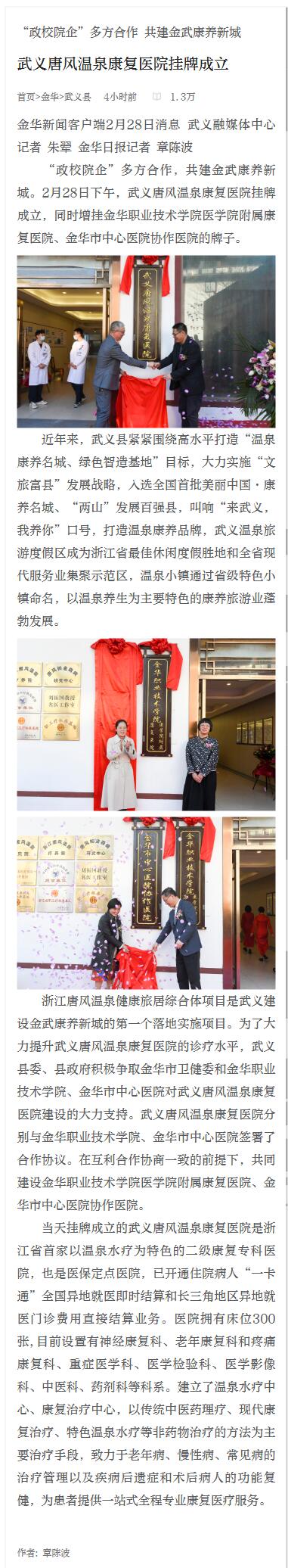 金华新闻客户端:武义唐风温泉康复医院挂牌成立