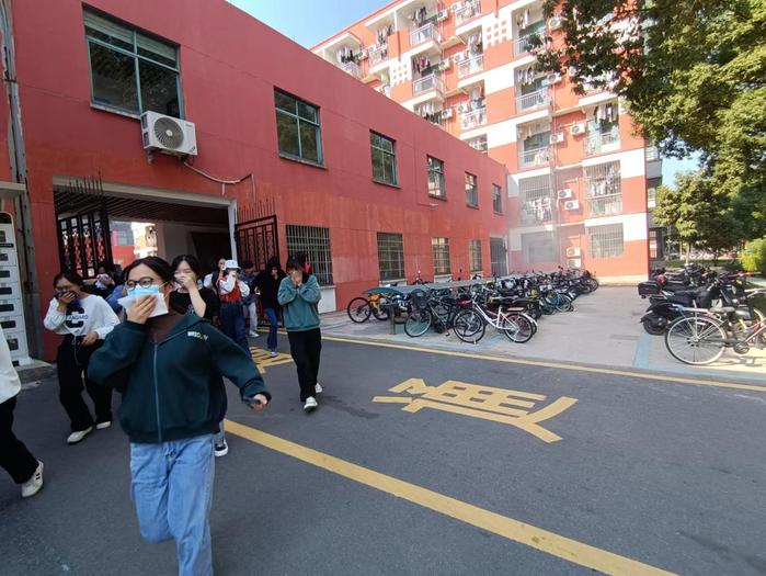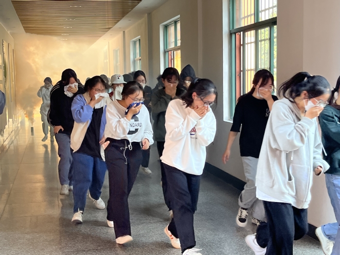 警报拉响,全员进入警戒状态,各班迅速进入紧急疏散状态,全体学生用湿毛巾捂住口鼻、低着头、弯着腰、贴着墙,按照逃生演练方案设定的逃生路线有序撤出宿舍楼,到达指定位置。