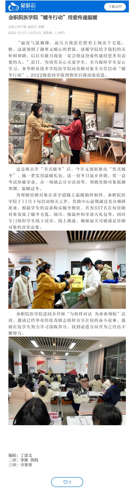 医路逐梦 ▏金彩云客户端:金职院医学院“暖冬行动”用爱传递温暖
