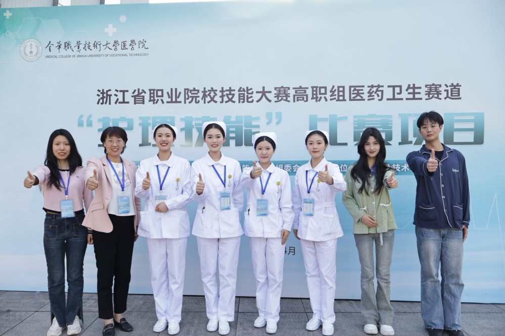 近日,2025年浙江省职业院校技能大赛高职组“护理技能”赛项在金华职业技术大学举行,来自全省14所院校27支参赛队伍参加。由金职大医学院护理专业8名学生组成的两支代表队,凭借过硬的专业素养、突破常规的创造力及极具感染力的表达呈现,在激烈角逐中成功问鼎赛事桂冠。其中,由陈桂园、王航赛两位教师指导,王昕媛、金雨萱、姜梓嫣和范杨柳4名学生组成的团体获比赛金奖;由邓娟、梁安东两位教师指导,张莹、单雅晴、蒋余欣和江云祥4名学生组成的团体获比赛铜奖。