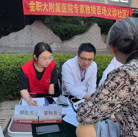 义诊现场,金职大附属医院的教授专家们认真为居民进行疾病诊断和健康咨询。他们凭借专业的知识和丰富的经验,耐心解答居民们的疑问,提供个性化的健康建议和治疗方案。志愿者们则在一旁认真协助,传递检查报告,向居民宣传健康知识,增强居民的健康意识。