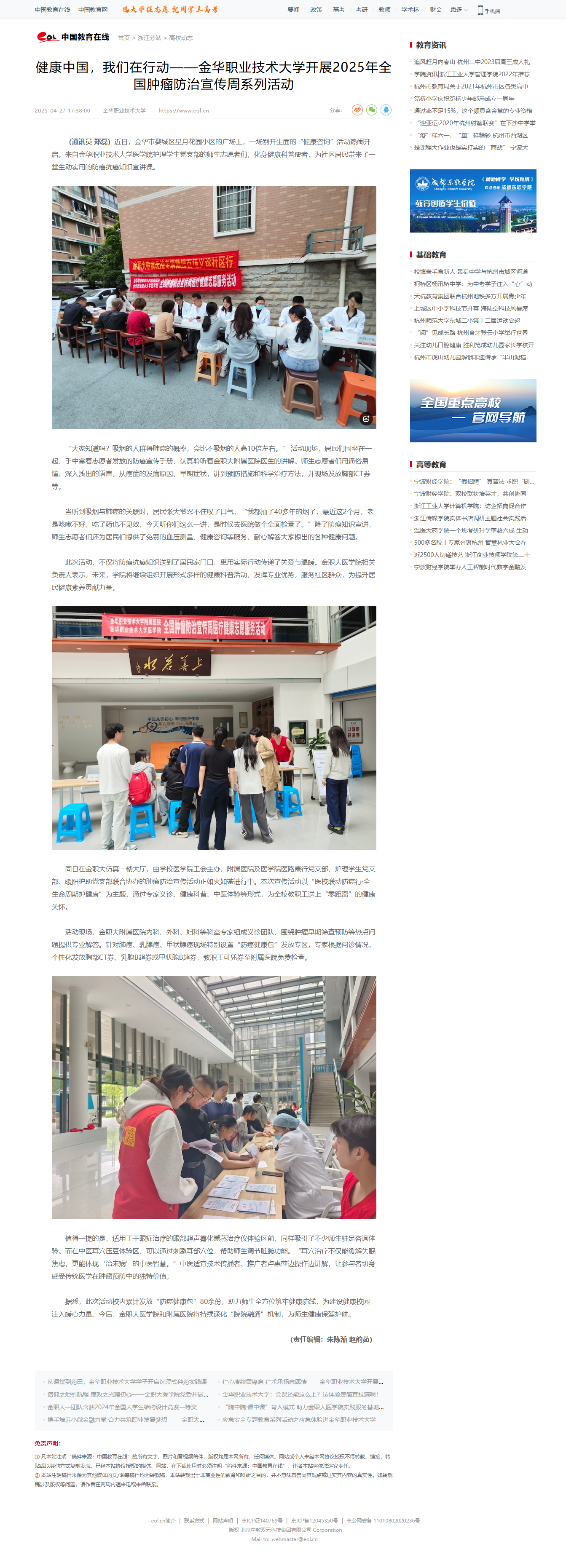中国教育在线:健康中国,我们在行动——金华职业技术大学开展2025年全国肿瘤防治宣传周系列活动