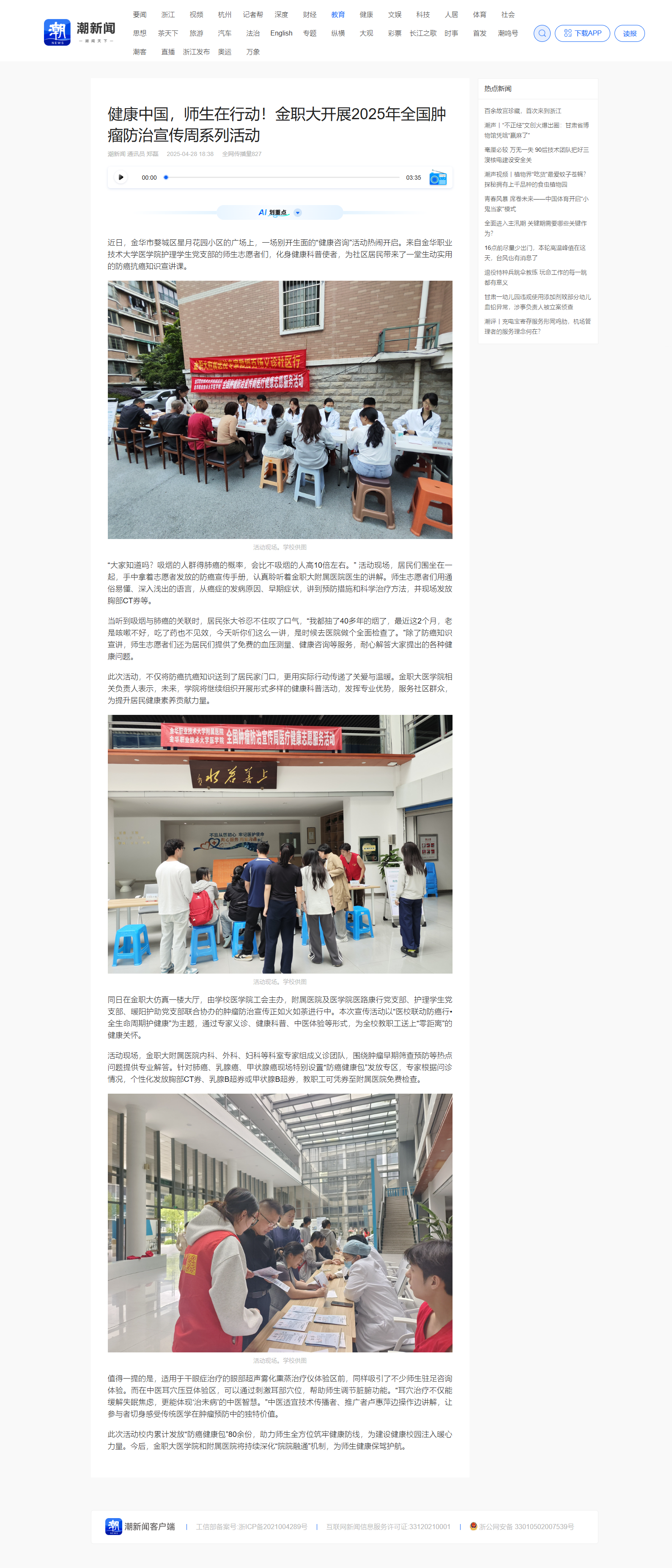 潮新闻:健康中国,师生在行动!金职大开展2025年全国肿瘤防治宣传周系列活动