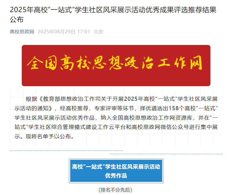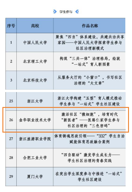 近日,由教育部思想政治工作司主办、全国高校思政网承办的2025年全国高校示范“一站式”学生社区风采展示活动评选结果正式公布。金职大《激活社区“微细胞”,培育时代“新医者”——医路仁家学生参与社区治理的“三色密码”》入选该展示活动的“学生参与”类优秀作品。