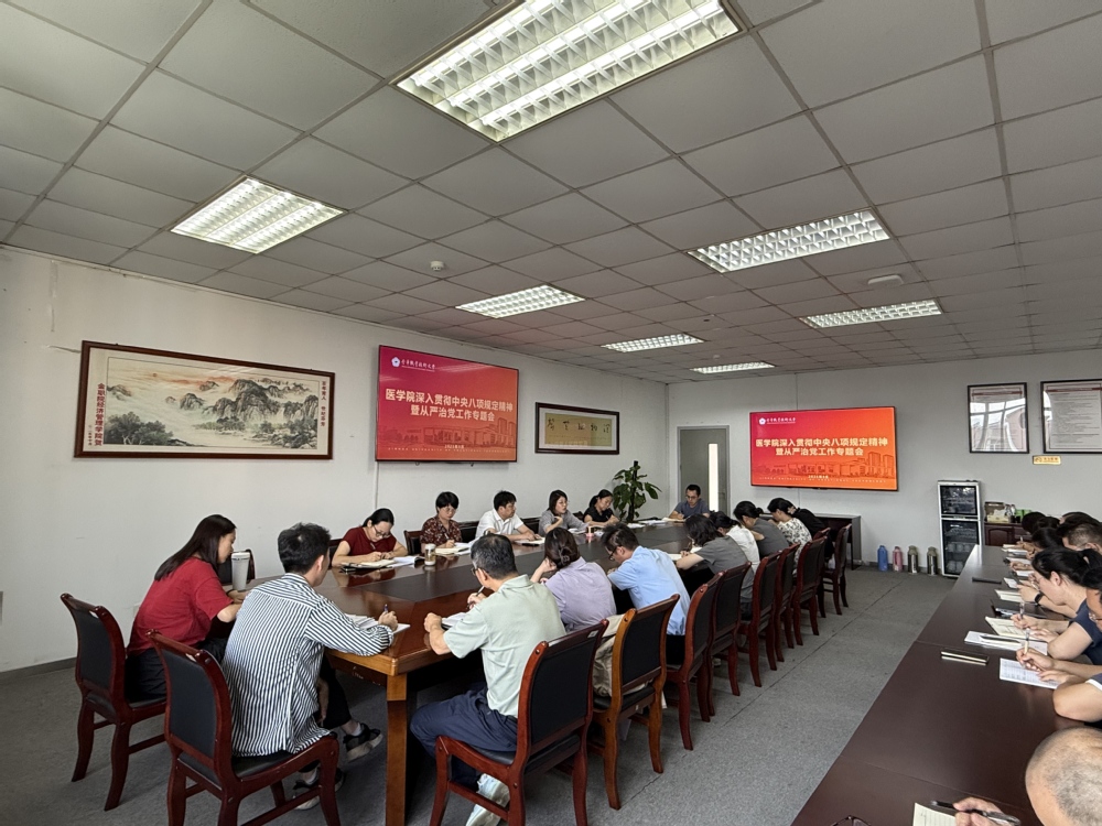 9月18日下午,医学院召开深入贯彻中央八项规定精神暨从严治党工作专题会,传达学习习近平总书记关于深入贯彻中央八项规定精神学习教育的重要指示精神以及中央、省委、市委和学校党的建设工作领导小组会议精神,并对学院开展深入贯彻中央八项规定精神学习教育进行总结,推动作风建设常态化、长效化,为学院高质量发展提供坚实的作风保障。学院党政领导班子成员、全体中层干部参加会议。