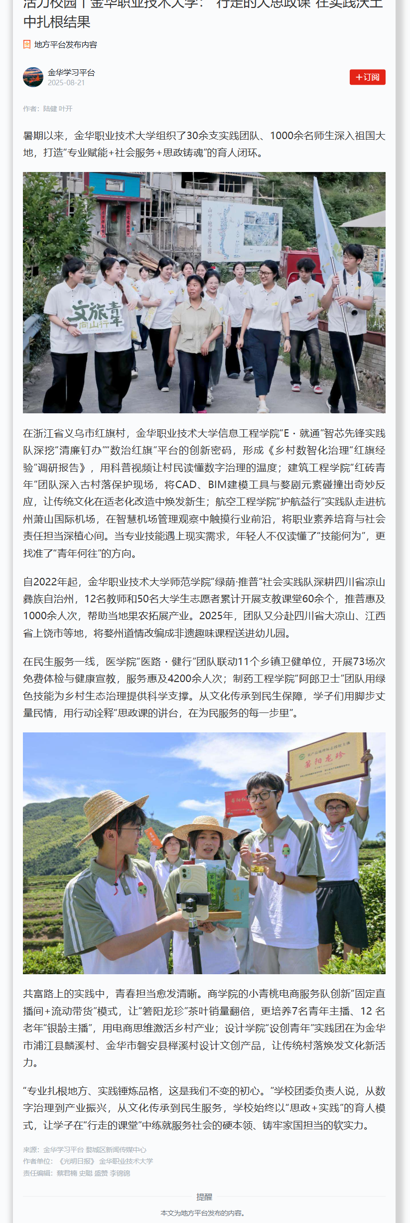 学习强国 金华学习平台:活力校园丨金华职业技术大学:“行走的大思政课”在实践沃土中扎根结果