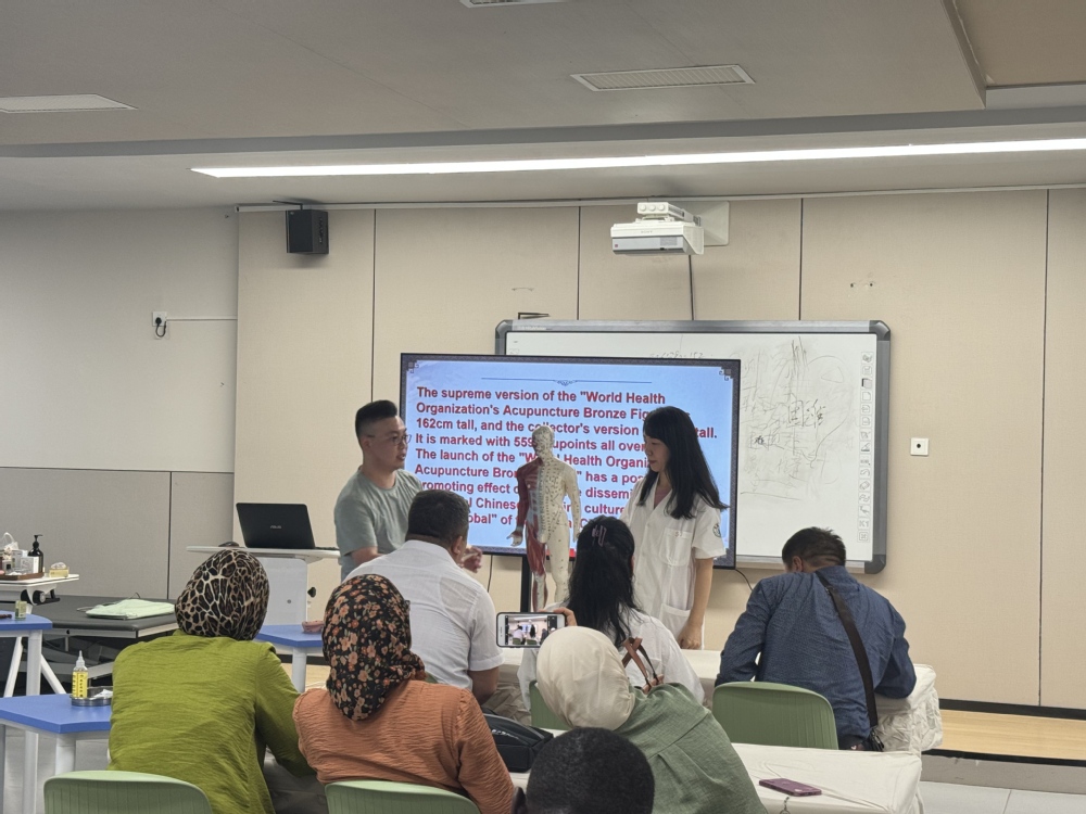 在仿真医院的康复治疗技术专业实训室内,两位专业教师借助人体经络腧穴模型,用中英双语细致拆解人体穴位的奥秘,确保学员能够准确理解中医理论基础;在各项理疗操作体验区,经过严格培训的医护学生们娴熟演示着每一项中医技法,将“新双高”建设倡导的“以技育人、以技通心”理念深度融入教学与互动的每一个环节。这种注重实践操作与文化浸润的非学历培训模式,不仅是中医实用技术的精准传授,更是搭建起一座连接中外的文化交流桥梁,让中医技艺成为“强国行”倡议下跨国交流的鲜活载体。