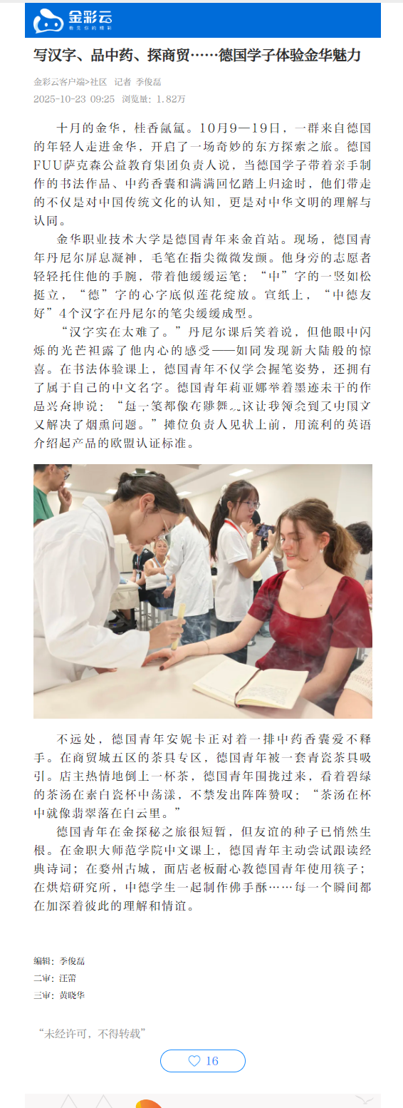 金彩云:写汉字、品中药、探商贸……德国学子体验金华魅力