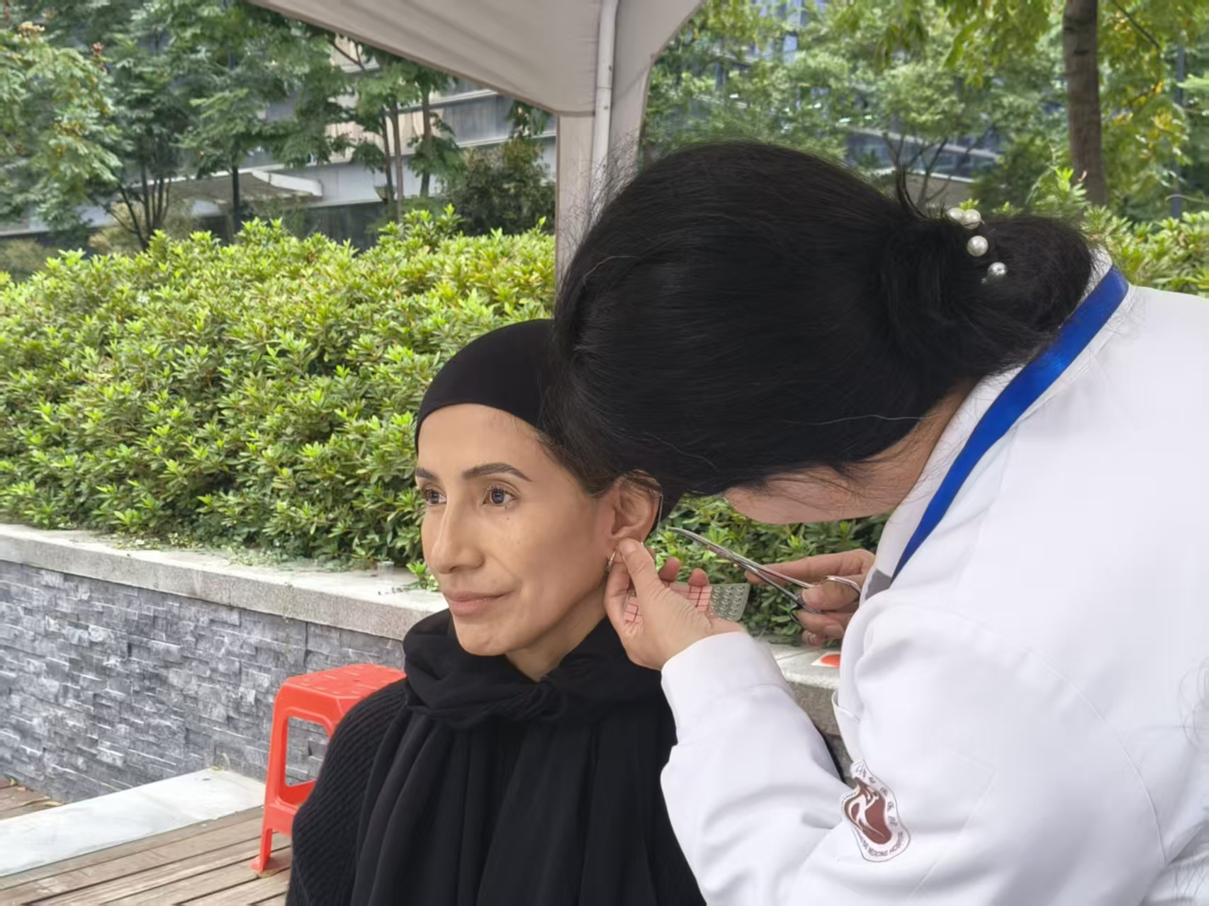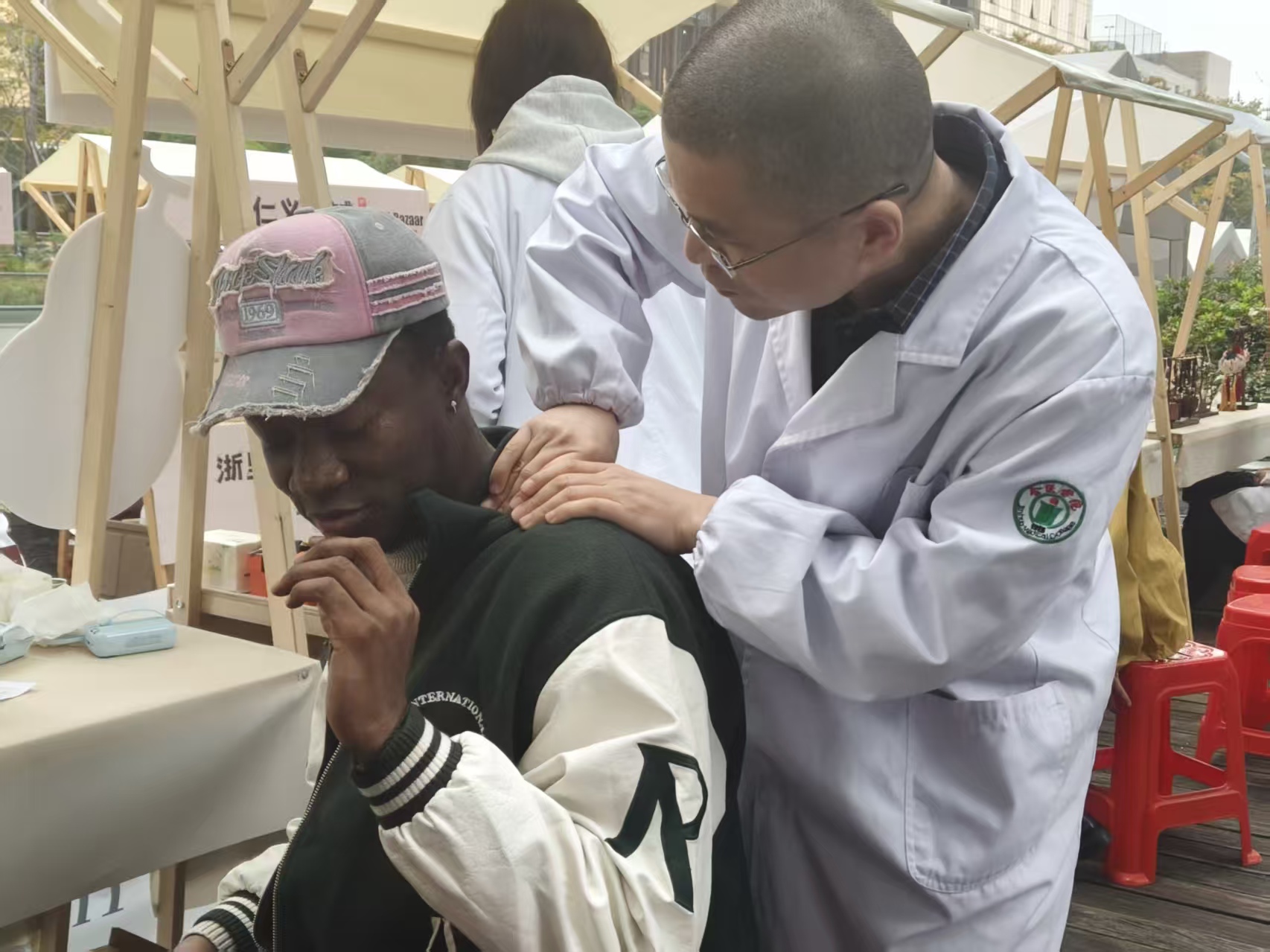 除了玛格丽特,现场还有很多在义乌经商、学习的外国友人参与其中。正在体验中医推拿的黑人小伙王一来自非洲,他特别提到:“中医推拿真是特别惊喜!大学的老师手法太专业了,推拿后肩颈的僵硬感马上缓解,整个人都舒服。”来自埃及的Monia女士表示:“耳穴压豆体验超棒!体验后疲劳感明显消退,非常愿意再次体验并推荐给身边人!”