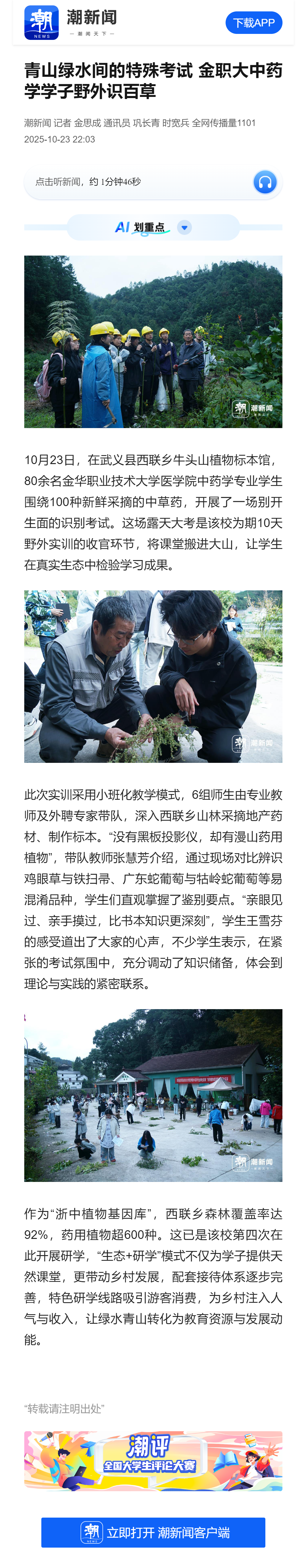 潮新闻:青山绿水间的特殊考试 金职大中药学学子野外识百草