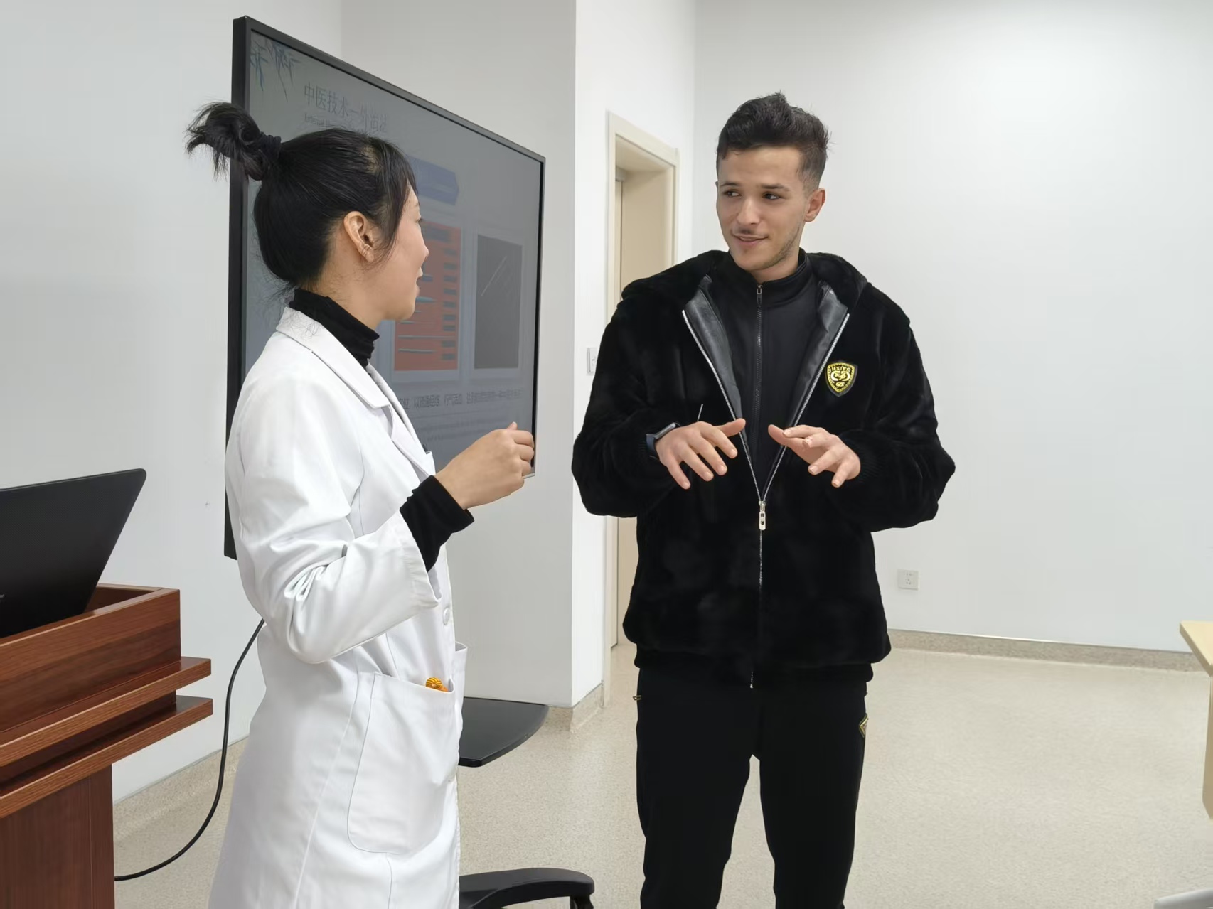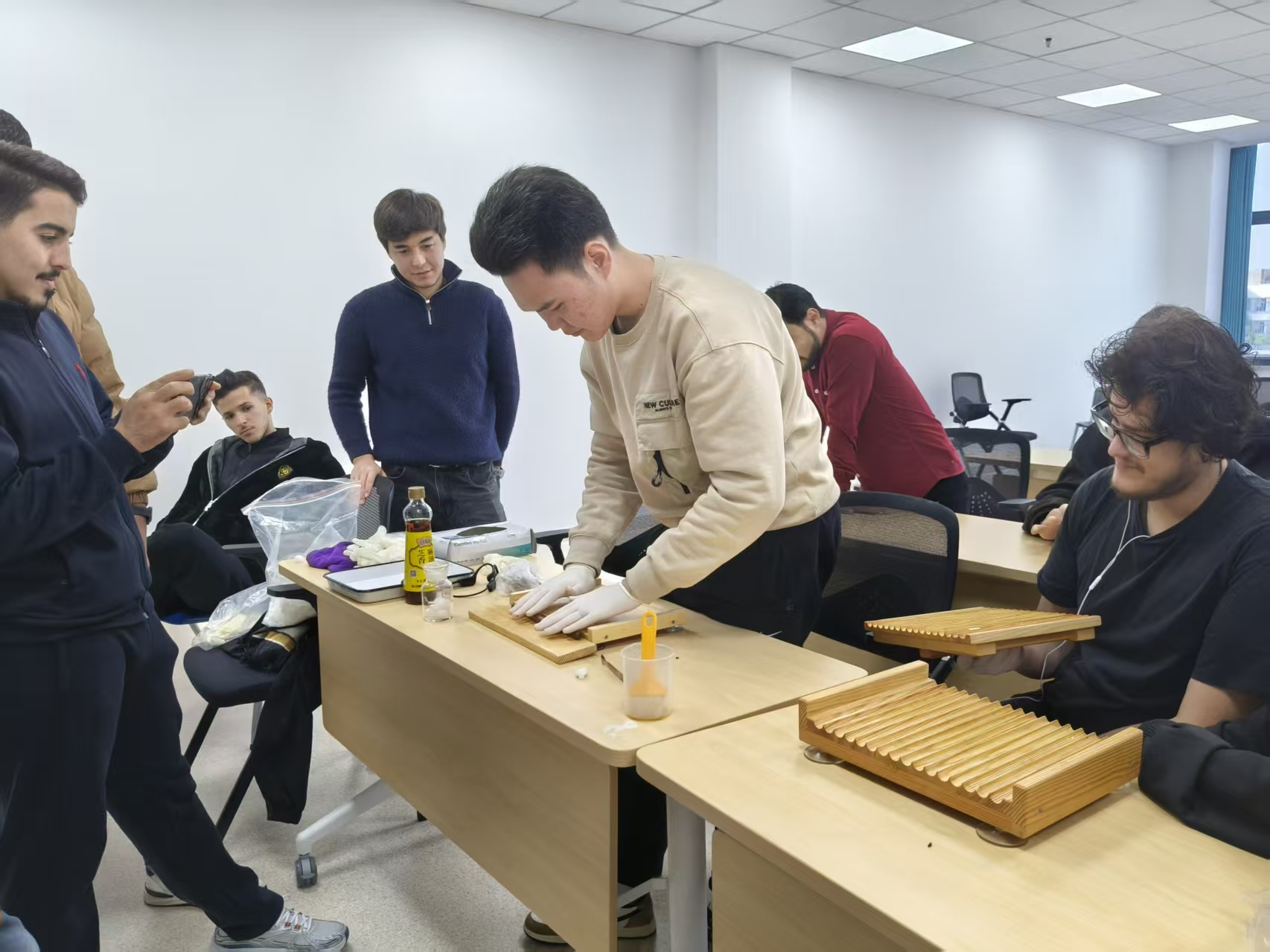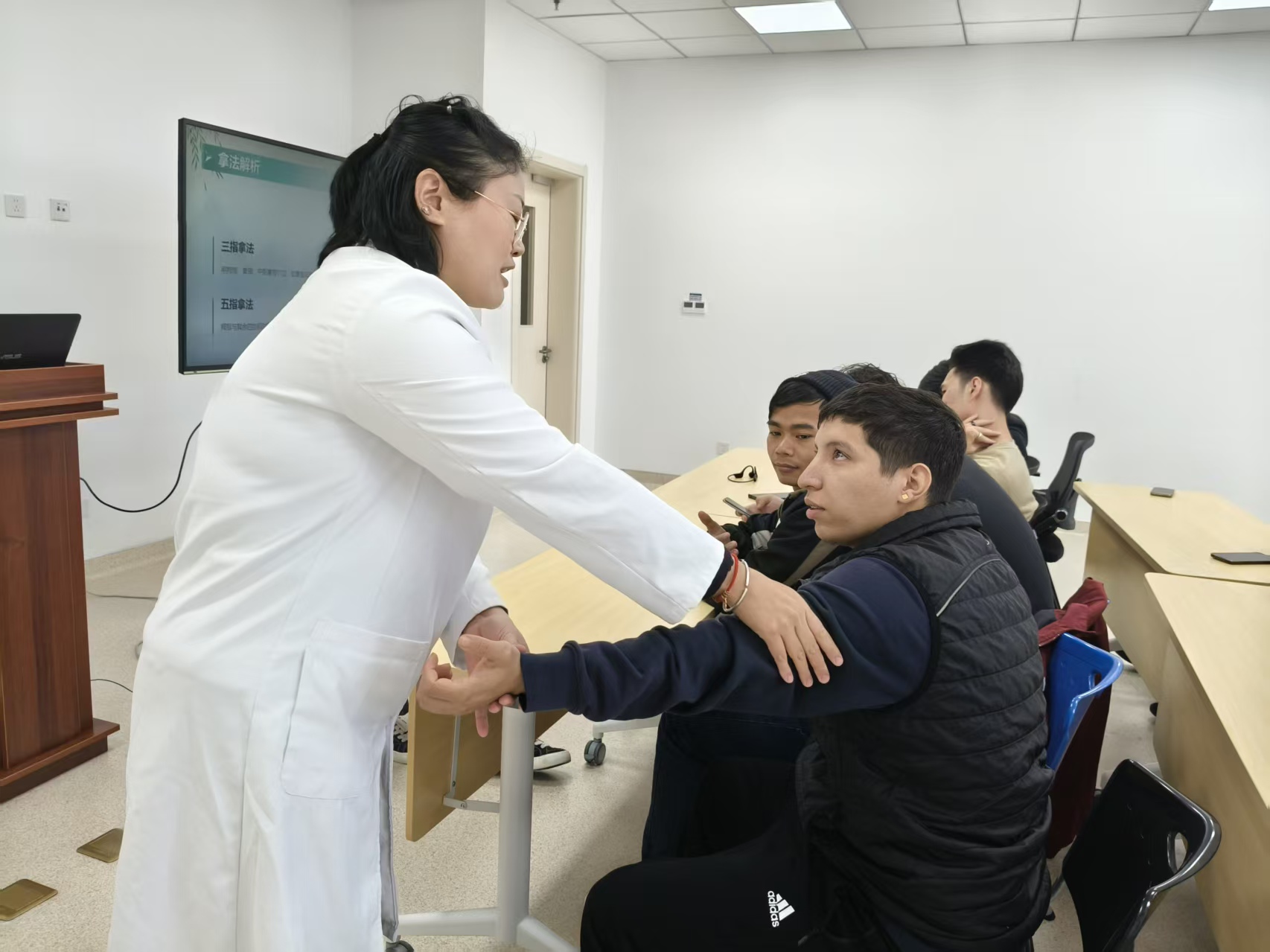 为引导留学生增进对中国传统医学的理解与认同,近距离感受中医药的独特魅力,近日,医学院“杏林讲堂”活动在附属医院培训教室开讲。本次活动是医学院“双高”建设特色任务之一,涵盖了针灸推拿等中医适宜技术的理论讲授及实践操作,以及中药大蜜丸的制作等多个环节。通过理论与实践相结合的方式,带来了一场内容丰富、互动性强的中医药文化体验。