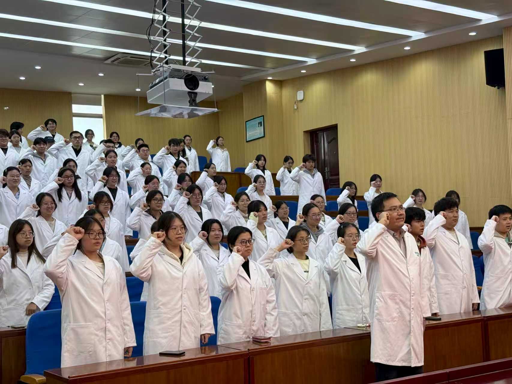接下来,在医路康行党支部副书记郑磊带领下,全体新生高举右拳、庄严宣誓,铿锵誓言响彻会场,展现了新一代金职医学生的坚定信念。“健康所系,性命相托。当我步入神圣医学学府的时刻,谨庄严宣誓:我志愿献身医学……”誓言铮铮,掷地有声,全体同学庄严宣誓,许下对生命的敬畏和对医学事业的热爱。