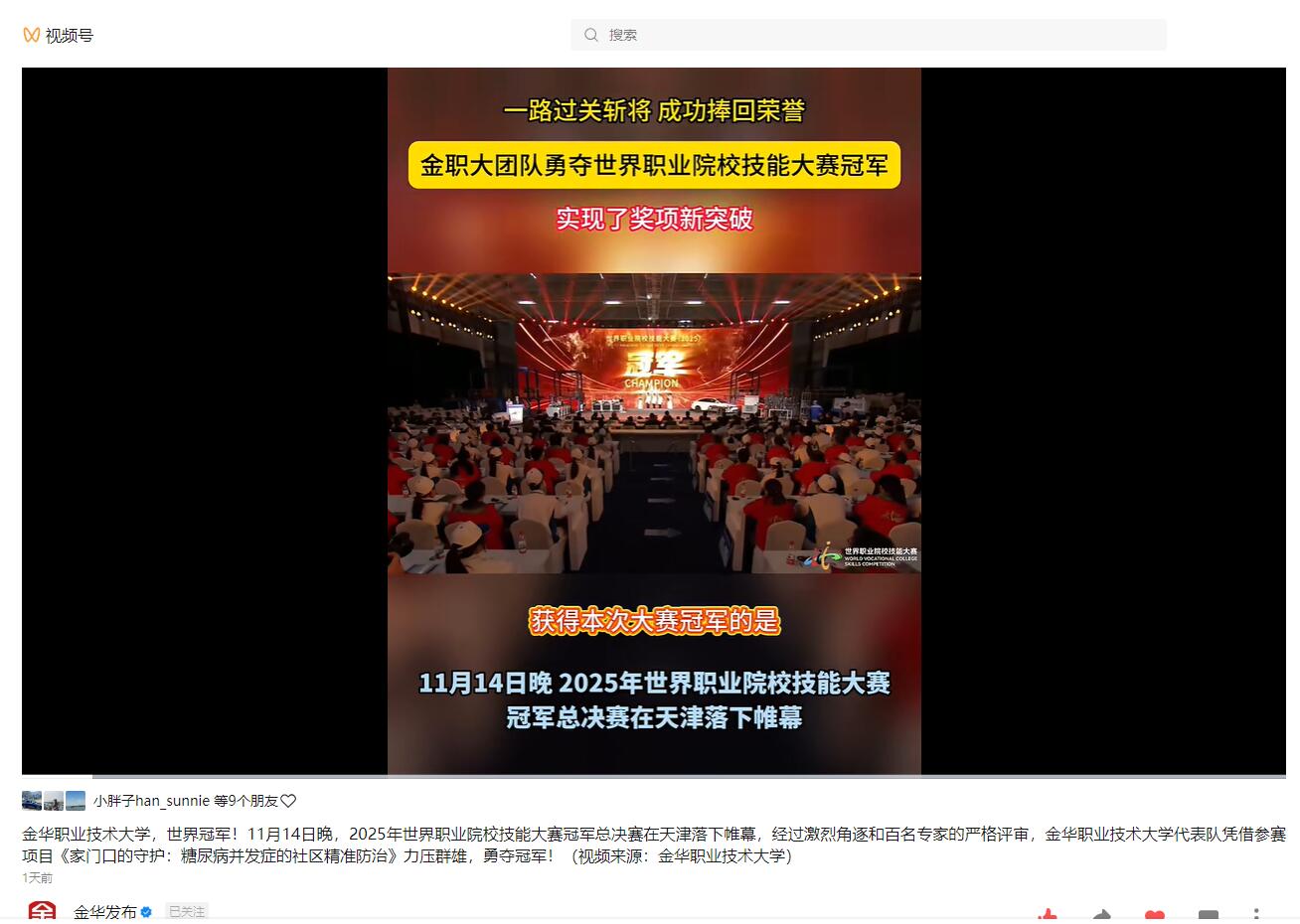 金华发布(视频号):金华职业技术大学,世界冠军!11月14日晚,2025年世界职业院校技能大赛冠军总决赛在天津落下帷幕,经过激烈角逐和百名专家的严格评审,金华职业技术大学代表队凭借参赛项目《家门口的守护:糖尿病并发症的社区精准防治》力压群雄,勇夺冠军!