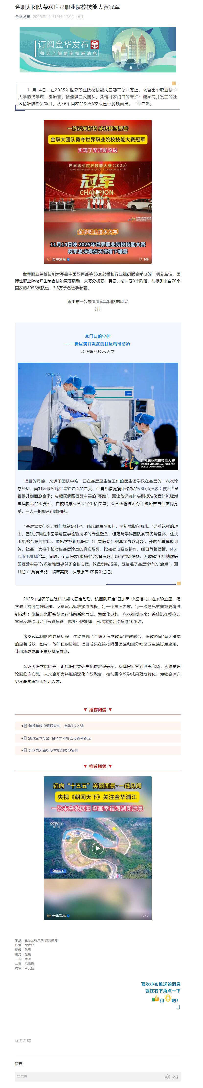 金华发布:金职大团队荣获世界职业院校技能大赛冠军