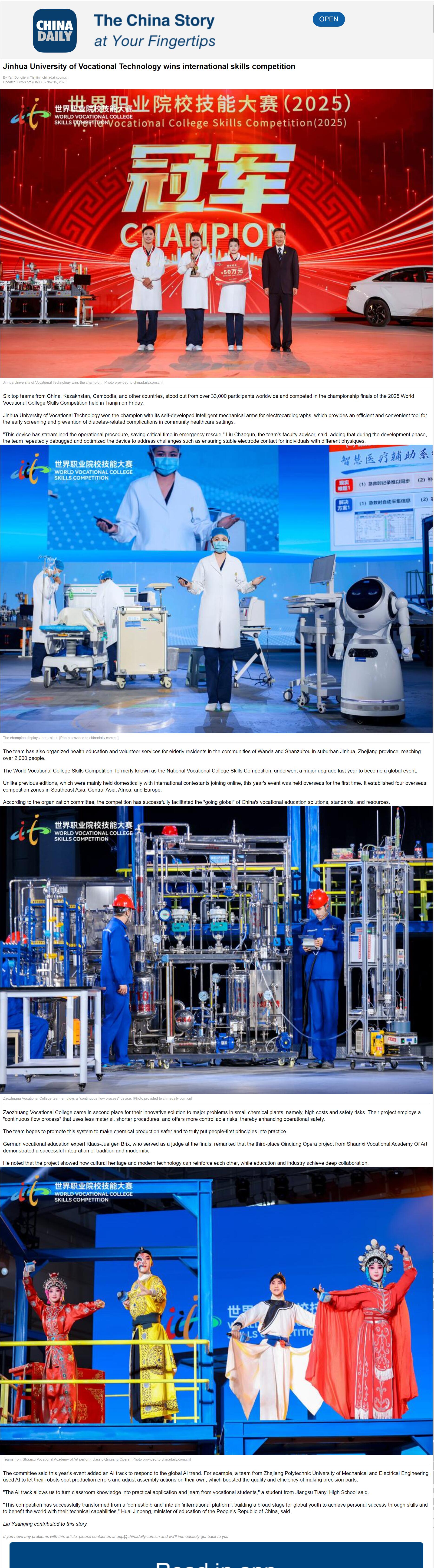 中国日报客户端:Jinhua University of Vocational Technology wins international skills competition