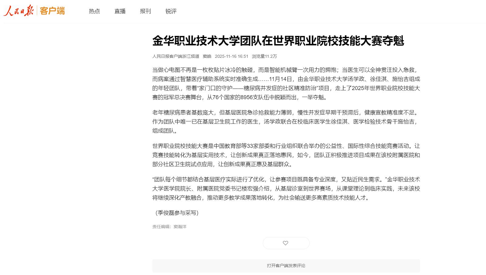 人民日报(浙江):金华职业技术大学团队在世界职业院校技能大赛夺魁