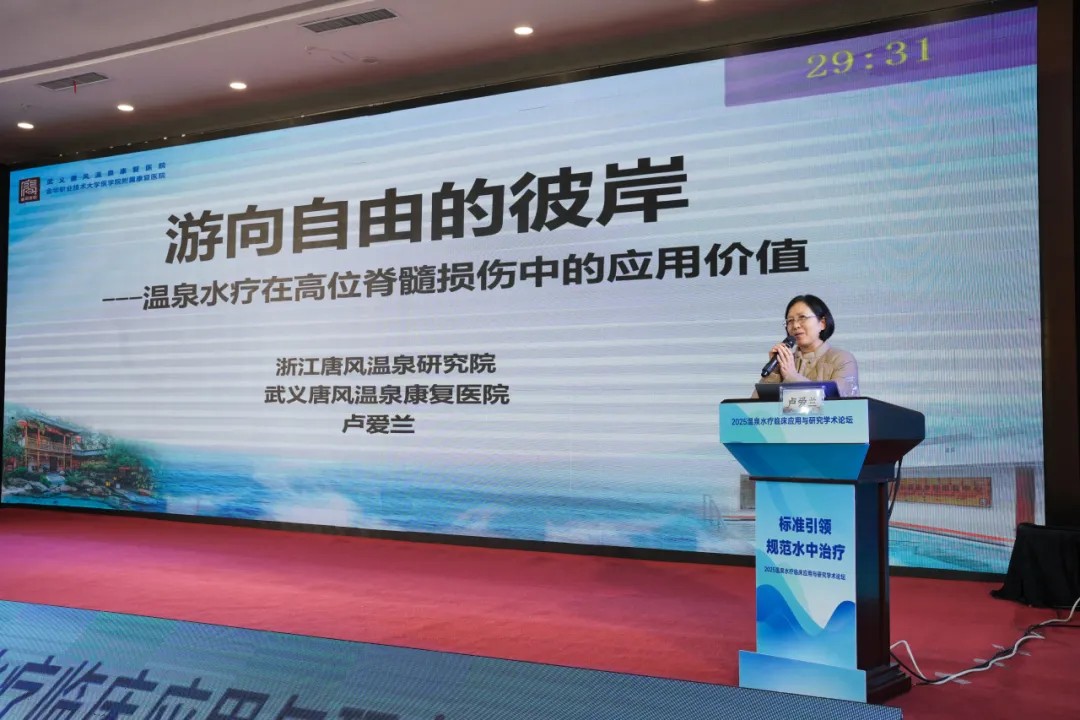 作为本次论坛的承办单位,金职大医学院康复专业相关负责人介绍了“政校企协作的中高职一体化温泉水疗专业人才培养模式”,系统讲解了学校在产教融合、标准引领下的康养技术技能人才培养实践,获得与会专家高度认可。金职大医学院附属康复医院副院长卢爱兰则围绕“温泉水疗在高位脊髓损伤中的应用价值”展示了临床研究成果,并牵头组织了团体标准论证与编写工作。