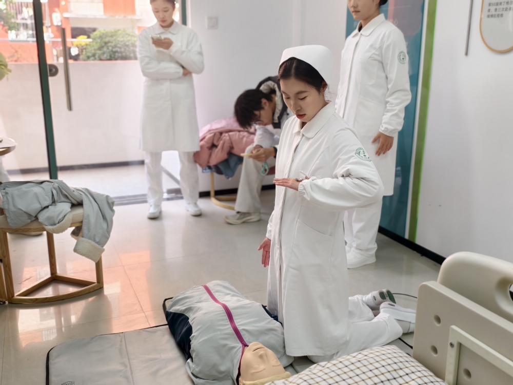 护理校赛在即,潘超君大师工作室与南丁格尔护理站已“全副武装”。同学们整装待发开启技能冲刺,两大功能室为满足学生备赛需求,特别开通“课余练兵”预约通道,下楼即达实训场、出门即入学习圈,实现“零距离”技能打磨。护理257班沈高昕说:“设在寝室楼下特别方便,练习时能观察别人的操作,对比自己哪里需要改进,这样互相学习效果更好。”从课堂到生活场景的无缝衔接,让专业知识真正“活”在每一次弯腰操作,让技能训练成为浸润式成长的日常。