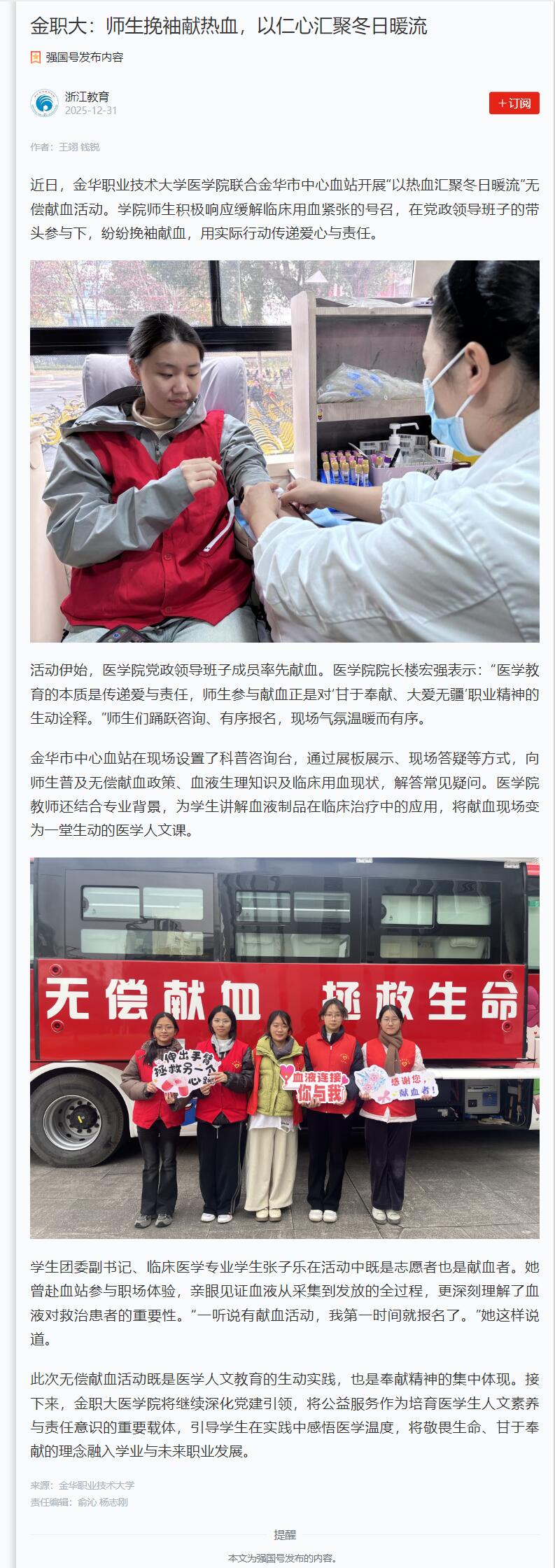 学习强国 浙江教育: 金职大:师生挽袖献热血,以仁心汇聚冬日暖流