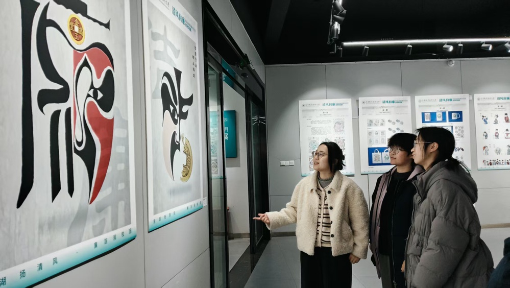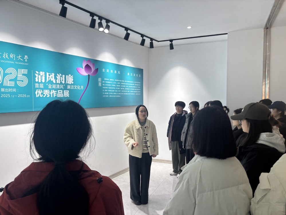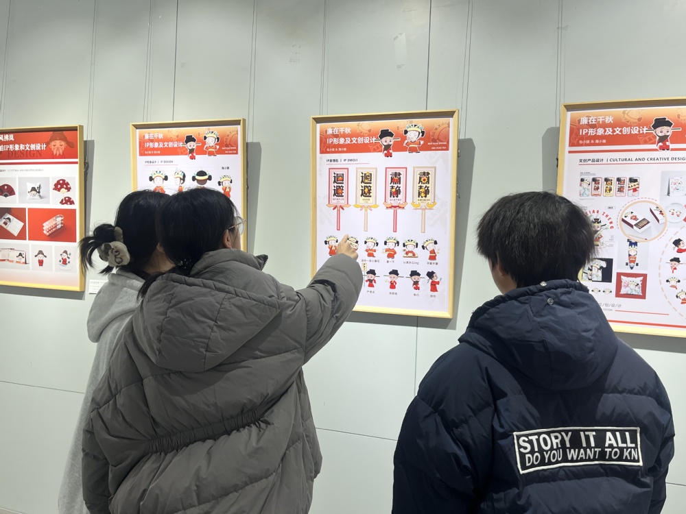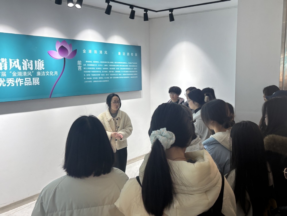 参观过程中,张晓艳还围绕参观作品的立意表现,引导同学们在接下来的活动中优化思想引领形式,通过脸谱书法、主题海报等作品的现场分析,指导大家学会把抽象的廉洁理念转化为可感可触的视觉语言,让同学们在艺术熏陶中感受廉洁熏陶。