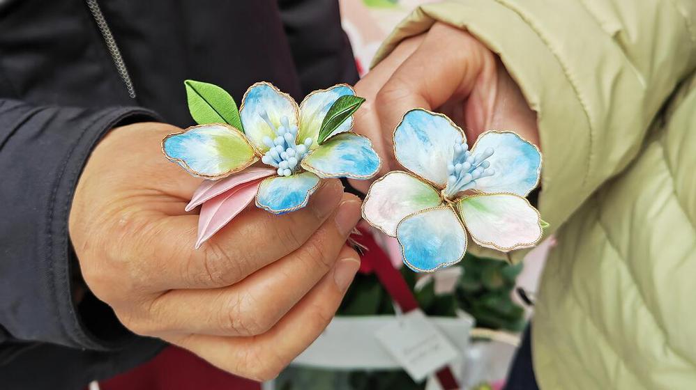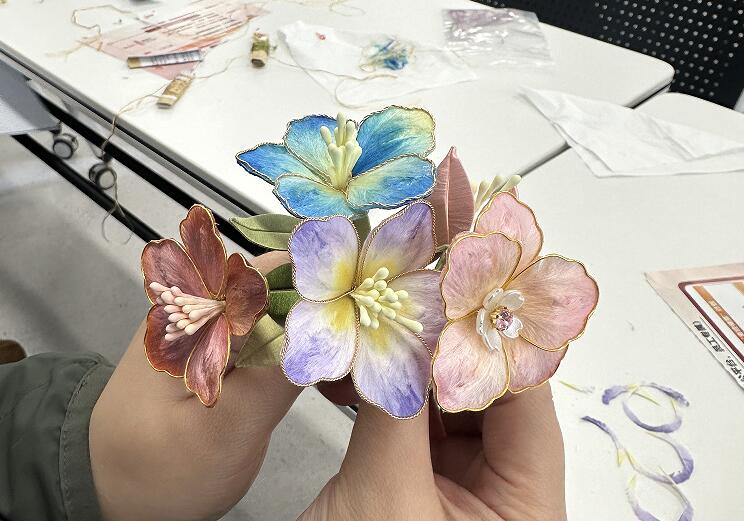 此刻,她们放下忙碌的工作,指尖捻动纤细绒线,小心翼翼地勾勒花瓣轮廓、调整花型弧度。有的反复琢磨“打尖”技巧,力求花瓣圆润饱满;有的相互交流搭配色彩,构思独特造型;还有的彼此之间请教细节,在欢声笑语中切磋技艺,氛围温馨而热烈。一朵朵色彩艳丽、造型灵动的绒花在指尖绽放,或缀成胸针,或做成发饰,每一件作品都承载着大家的巧思与期许,也凝聚着对优秀传统文化的热爱与传承。