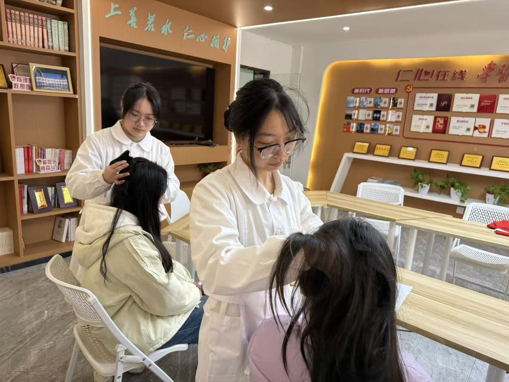 同时,校园健康服务体验活动同步开展,将专业技能与就业实践紧密结合。本次实践活动主要面向大二同学,重点强调了职场的前瞻性规划。在护理党支部书记工作室健康服务站,大二的志愿者们为师生提供血压测量、血糖检测等基础服务,并开展特色艾草精油砭石头疗护理。运用泗滨砭石刮痧板,搭配艾草精油,以专业手法舒缓头部经络、缓解身心压力,在实践中巩固中医护理、健康管理等核心技能。此次健康服务不仅是一次技能实践,更是一场贴近未来就业场景的实战演练,帮助同学们提前熟悉基层医疗、社区健康服务等岗位内容,进一步提升就业竞争力与职业认同感。