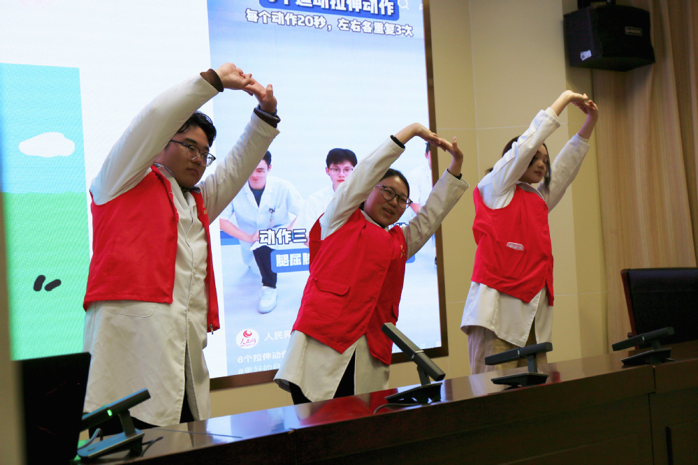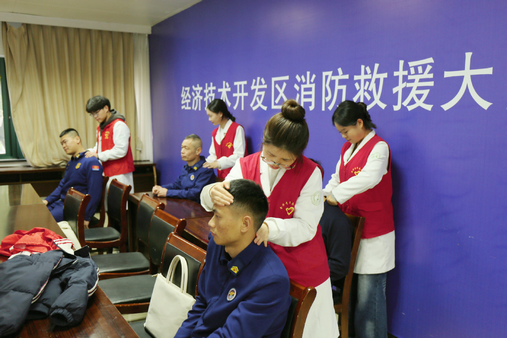 不仅如此,根据消防员长期训练、执行任务产生的肩颈、腰背、膝关节劳损等实际问题,康复治疗技术专业的同学在现场开展了一场“舒缓小课堂”,通过PPT讲解、现场示范,指导大家学习了简易的肌肉放松操,还为消防员进行了简易的肌肉状态评估,通过专业的肌肉放松手法,缓解消防员因训练产生的身体疲劳与肌肉酸痛。