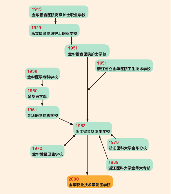 1915年,随着新文化运动的兴起,金华福音高级护士职业学校成立,首任校长马铿哲大力倡导科学教育,为当时重要的教育思潮之一;从1915至1949年,学校经历了奋力前行的萌芽时期(1915 -1926 ),平稳发展时期( 1927- -1937) ,抗战后逆境图存的低谷时期( 1937年一-1949年)。35年间,西医教育从无到有,并实现了从“师授徒”到正规学校教育形式上的转化,为后人积累了丰富的在不同条件、背景下的多元办学模式的经验。1949年,新中国建立后,国家财政经济状况好转,学校扩大招生; 1952年,正式定名为“浙江省金华卫生学校”; 1958年,全国爱国卫生运动如火如荼,金华医学院应远而生: 1969年,因“文革”,学校停办,1972年恢复招生; 1979年成为浙江医科大学金华分校: 1980年被评为全国重点卫校。2000年,升格为金华职业技术学院医学院;2024年6月,首批设置护理职业本科专业。百年的发展征程,曾留下金华医专、金华医学院、浙医大金华分校的办学足迹。2024年成为学校首批升格的职业本科专业。累计为社会输送技术技能人才4万余名。
